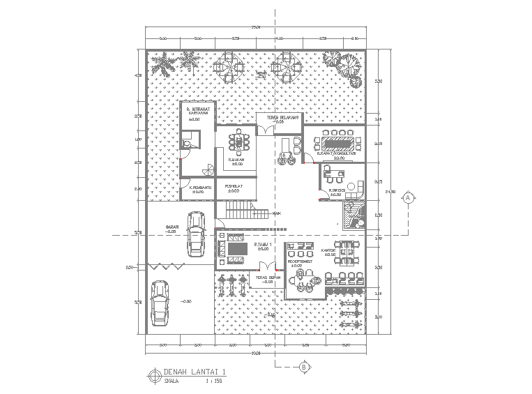19x25m ground floor office building is given in this Autocad drawing file. Download now.