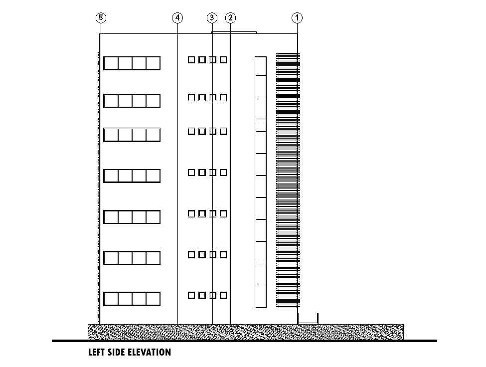 Left side elevation of 24x17m office building is given in this Autocad drawing file. Download now.