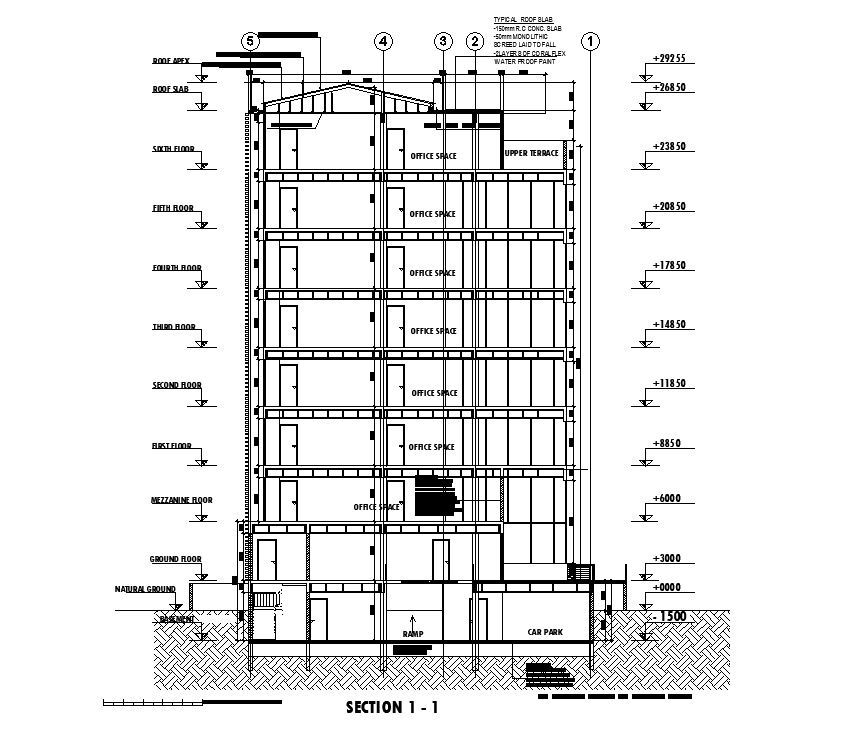 Front section view of 24x17m office building is given in this Autocad drawing file. Download now.