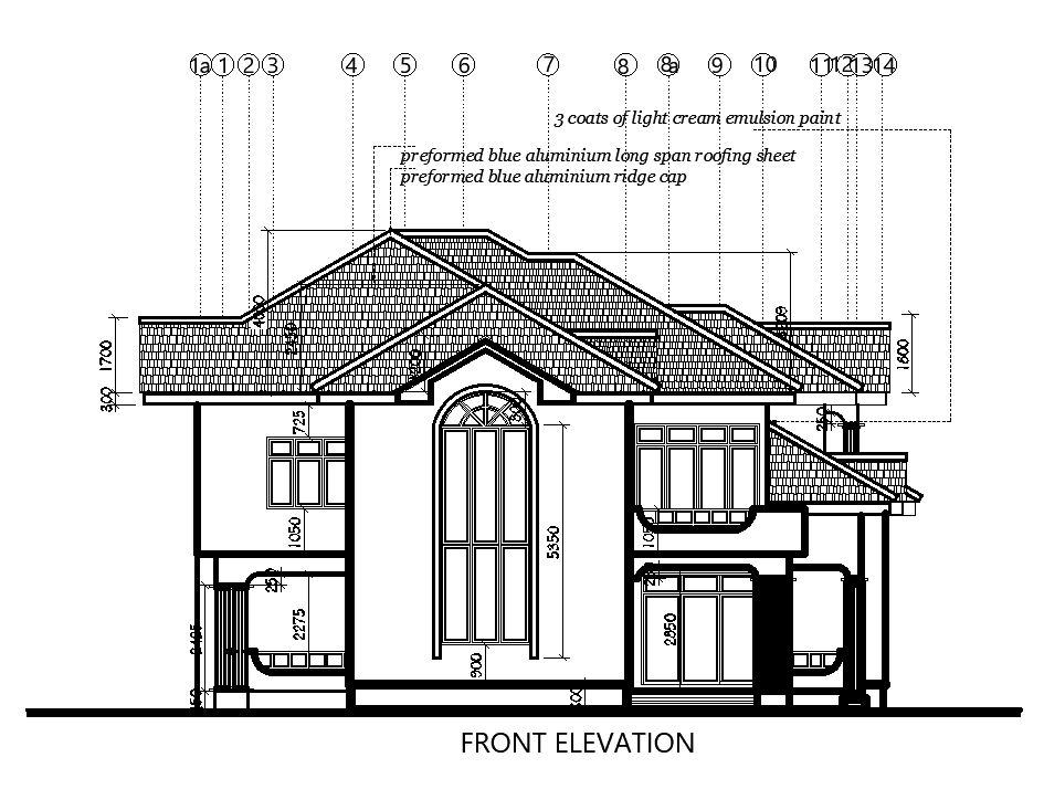 Front side elevation of 21x16m house plan is given in this Autocad drawing file. Download now.