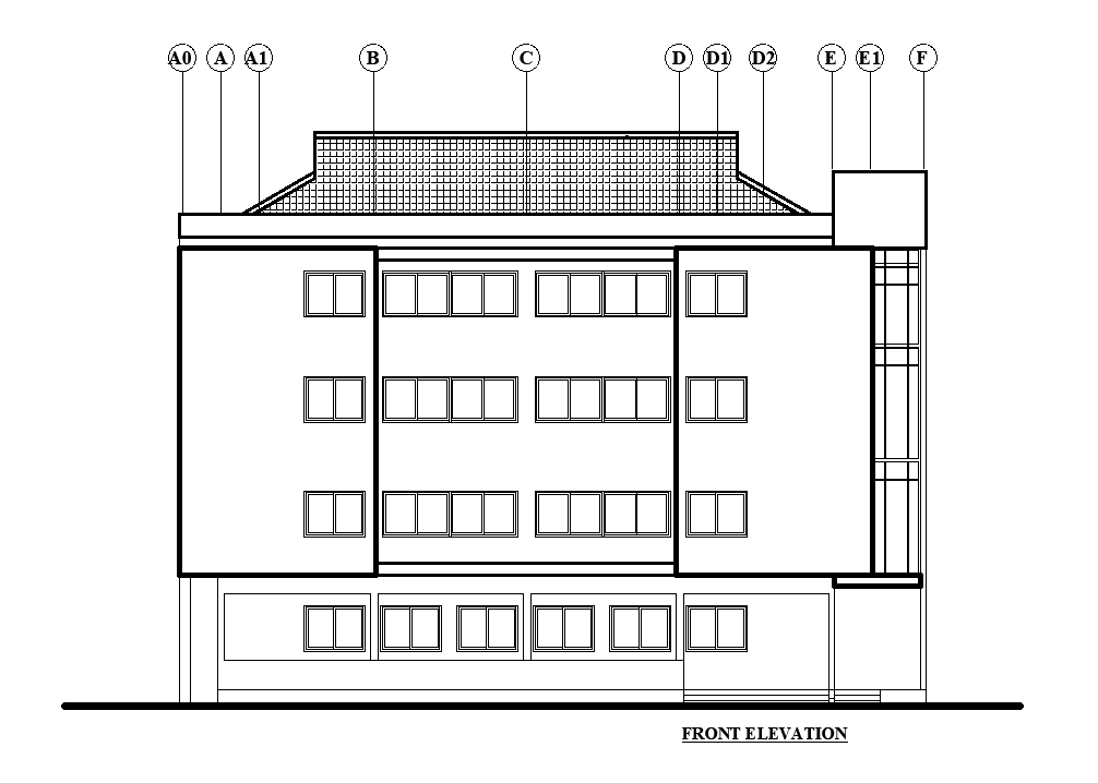 Front side elevation of 18x4m ground floor restaurant plan is given in this Autocad drawing file. Download now.