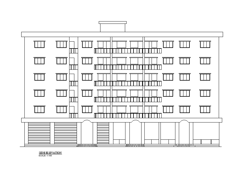 Side elevation of the G+5 apartment building is available in this Autocad drawing file. Download now.