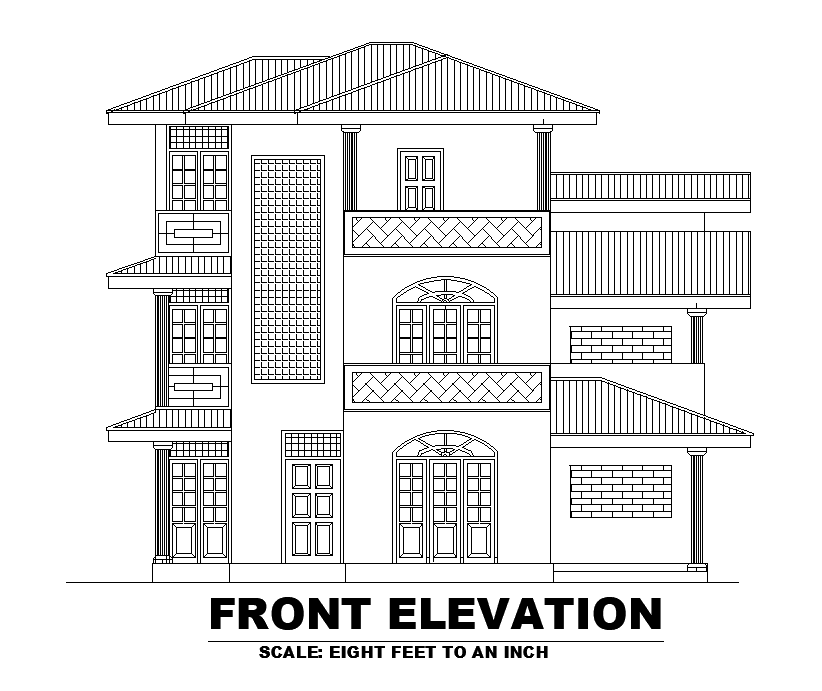 Left side elevation of 8x14m house plan is given in this Autocad drawing file. This is G+2 house building. In the ground floor, car parking, garden, dining area, living hall, kitchen, common toilet, and rest area is available. In the first floor, the master bedroom with attached toilet, kid’s room, guest room and common toilet is available. In the second floor, the master bedroom with attached toilet, kid’s room, guest room and common toilet is available. For more details download the Autocad file. Thank you for downloading the Autocad file and other CAD program files from our website.