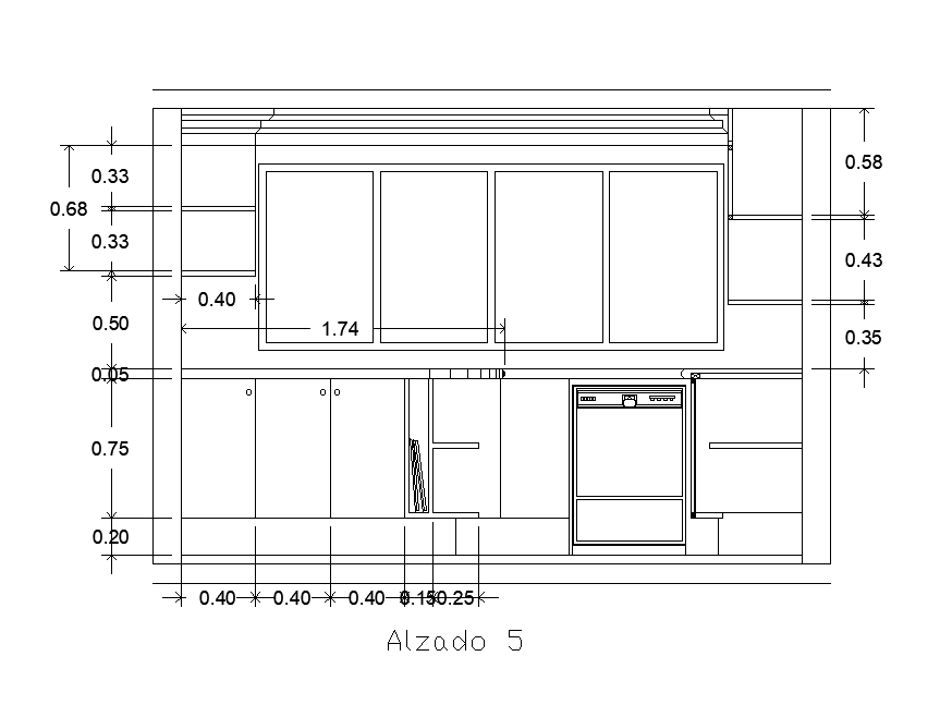 Right side section view of 3x2m kitchen plan is given in this Autocad drawing file. The length and breadth of the plan is 5m and 4m respectively. In this plan, oven are, gas stove place, sink, shelf and dining area and other details are mentioned. For more details download the Autocad file. Thank you for downloading the Autocad file and other CAD program files from our website.
