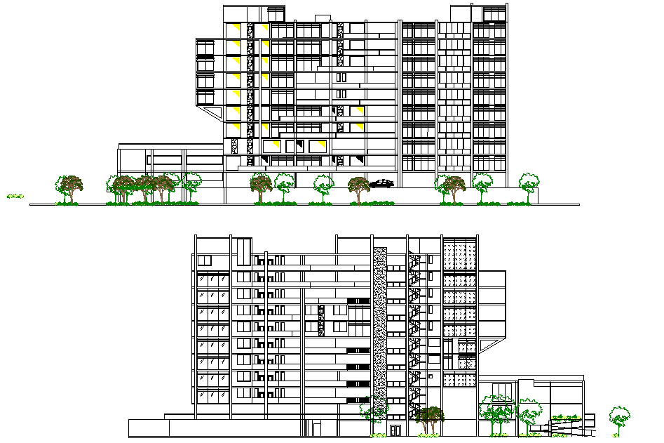 The apartment building elevation of the G+10 storey floor level building model design which includes houses, the living area, kitchen, dining area, master bedroom with attached toilet, kid’s room, guest room and common toilet is available. For more details download the Autocad file. Thank you for downloading the Autocad file and other CAD program files from our website.