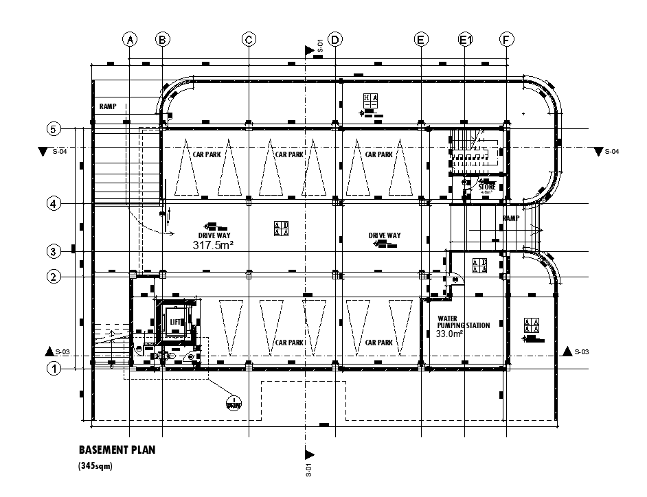 24x17m basement floor office layout is given in this Autocad draiwing file. Total area of the floor is 345sqm. This is G+6 office building. In this floor rest room for male, ladies toilet, lift, electrical room, water pump station, ramp, store, car parking, drive way and other details are given in this drawing model. For more details download the Autocad file. Thank you for downloading the Autocad file and other CAD program files from our website.