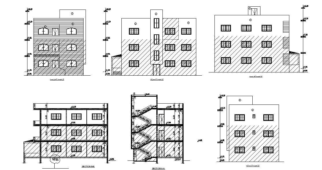 3 Storey Floor Level Apartment Building Section And Elevation Drawing Download DWG File