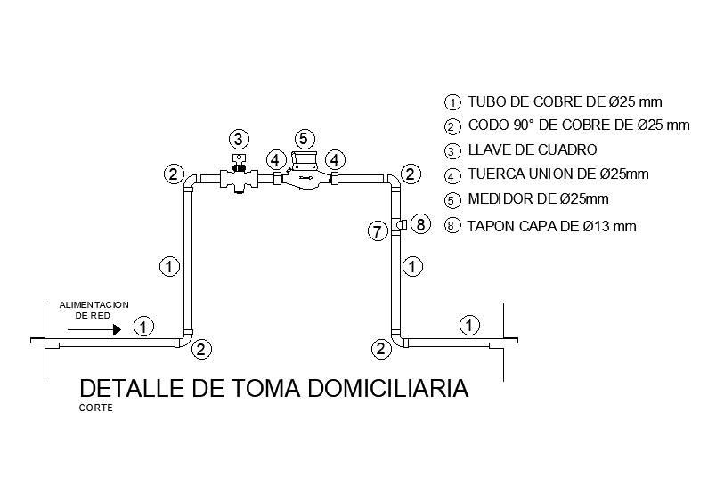 Detail of home intake pipeline drawing stated in this AutoCAD file. Download this 2d autocad drawing file.