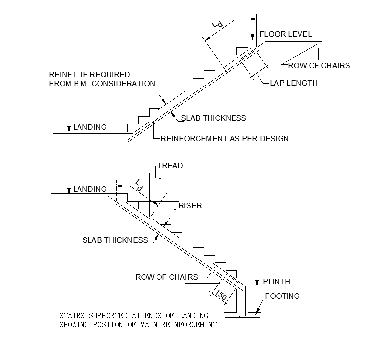 Staircase detail drawing presented in this AutoCAD file. this file consists of reinforcement detail with steel bar section detail can be used for working detail drawing. this can be used by architects and engineers. Download this 2d AutoCAD drawing file.