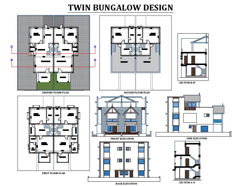 Wonderful Twin bungalow house floor plans, section and elevation cad drawing. Download this cad DWG file.