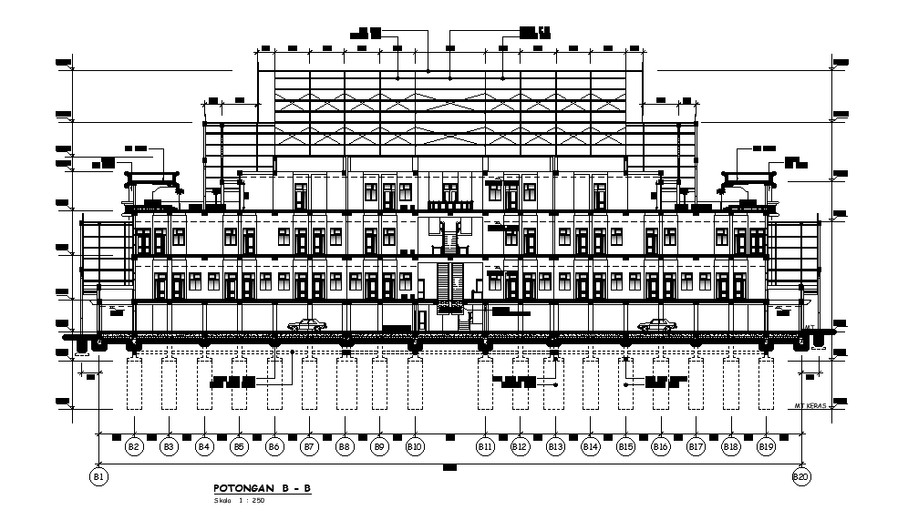 Front elevation plan of 72x30m elevation of the office building is given in this Autocad drawing file. Download now.