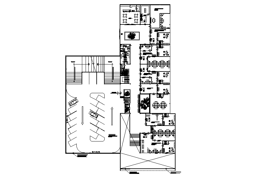 Ground floor office plan is given in this Autocad drawing model. This is given with the biggest car parking. The rest room for male & toilet, garden, director room with attached toilet, office room, secretary room with attached toilet, reunion hall, conference hall, cafeteria, common toilet, exhibition area and other details are given in this model. For more details download the Autocad file. Thank you for downloading the Autocad file and other CAD program files from our website.