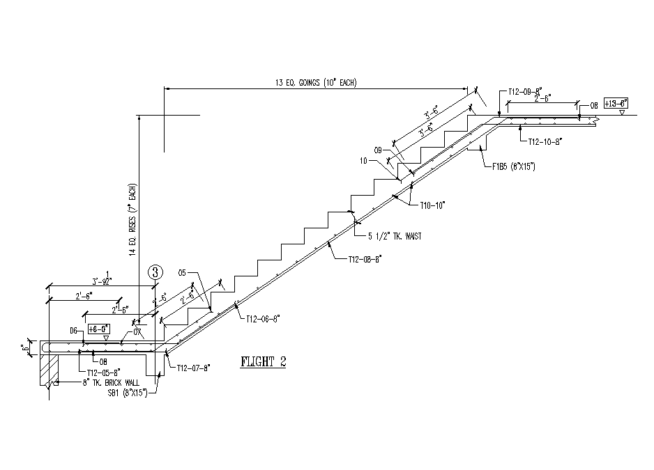 A staircase flight 2 section view is given in this Autocad drawing file. 8” thickness of brick wall is provided. Reinforcement details, column details, and measurements are given in this drawing model. For more details download the Autocad drawing file. Thank you for downloading the Autocad file and other CAD program files from our website.