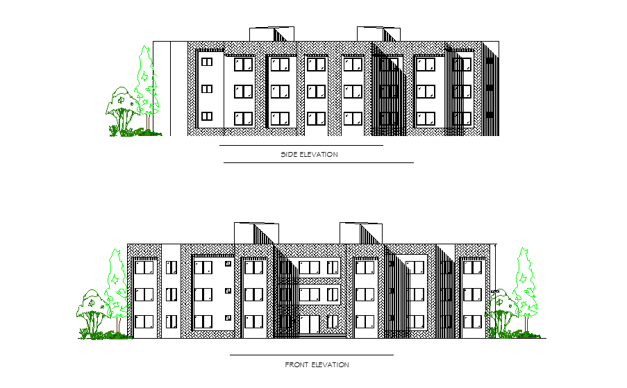 Front elevation of the college admin office building is this Autocad drawing file. Download now.