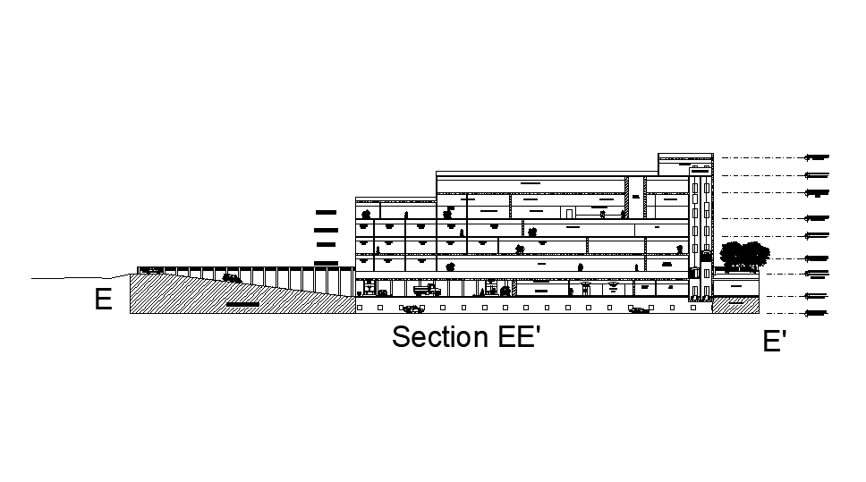 Back side section view of shopping complex building is given in this Autocad drawing file. Download now.