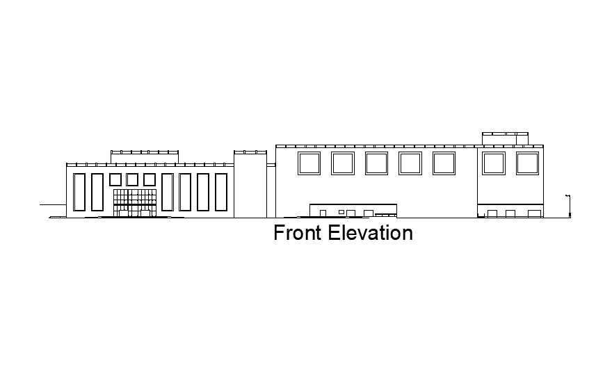 Front elevation of shopping complex building is given in this Autocad drawing file. Download now.