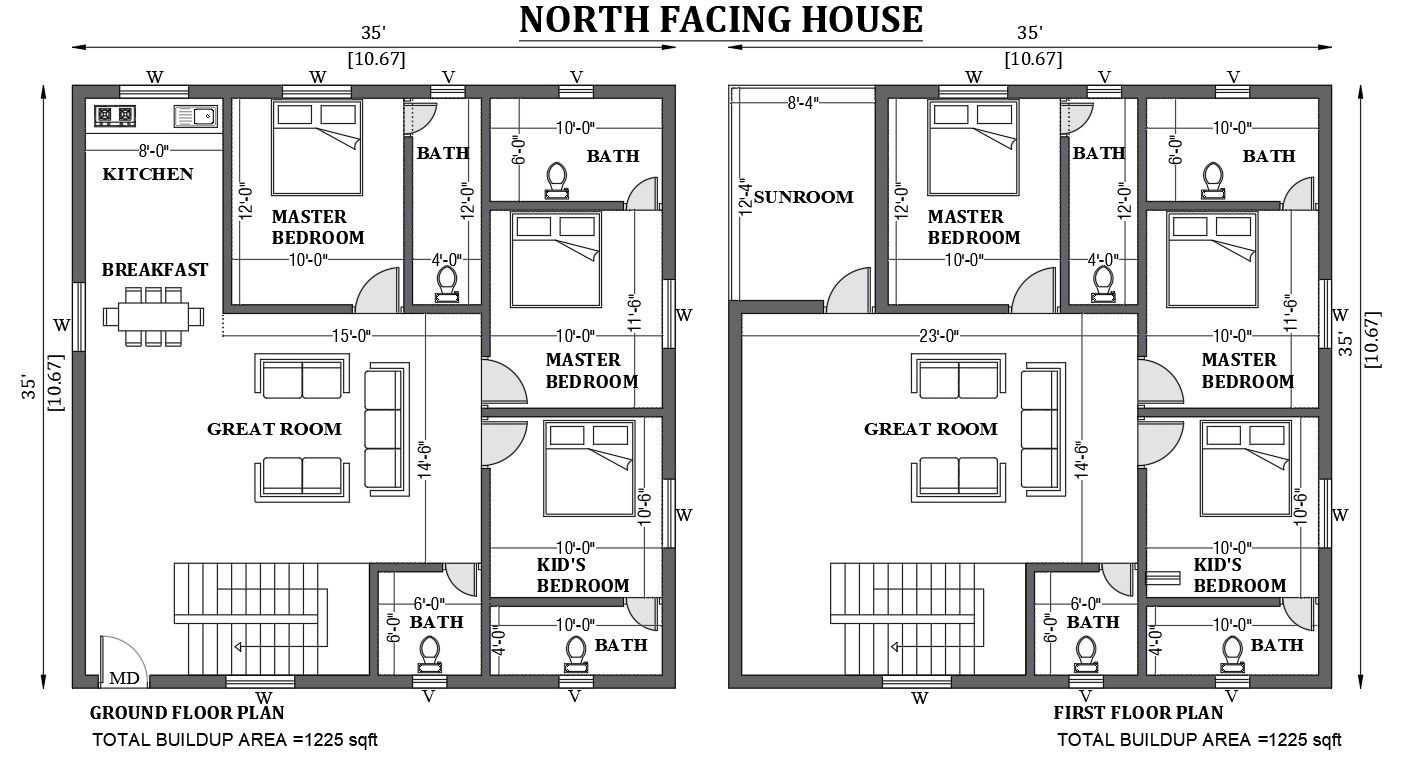 35'x35' north facing house design as per Vastu shastra is given in this FREE 2D Autocad drawing file. The total built-up area of the plan is 1225sqft. In this ground floor plan master bedroom with attached bath, second master bedroom with attached bath, kid's bedroom with attached bath, common bath, passage, great room, kitchen, and breakfast is available and on the first-floor master bedroom with attached bath, kid's bedroom with attached bath, second master bedroom with attached bath, common bath, passage, great room, and sunroom are available. download this 2D Autocad drawing file.