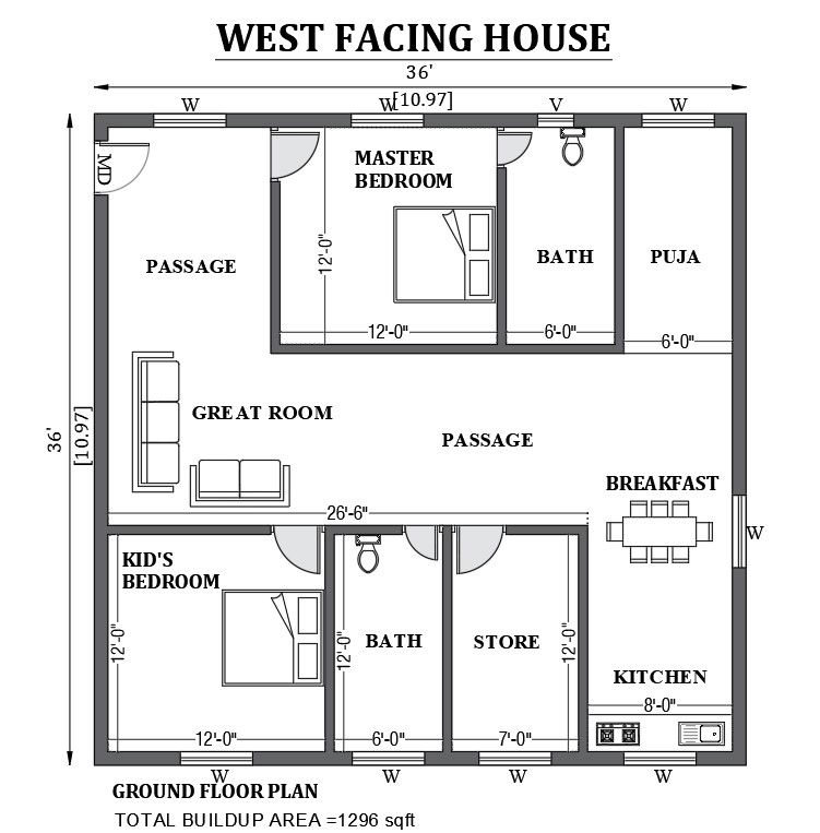 36'x36' west facing house design as per Vastu shastra is given in this FREE 2D Autocad drawing file. The total built-up area of the plan is 1296sqft. In this floor plan master bedroom with an attached bath, a kid's bedroom with an attached bath, passage, a great room, a storeroom, puja, breakfast, and a kitchen are available. download this 2D Autocad drawing file.