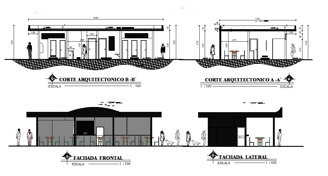 Corte and fachada of restaurant building is given in this Autocad drawing model. This is single story restaurant building. Total height of the restaurant building is 3.55m. For more details download the Autocad drawing file. Thank you for downloading the AutoCAD drawing file and other CAD program files from our website.