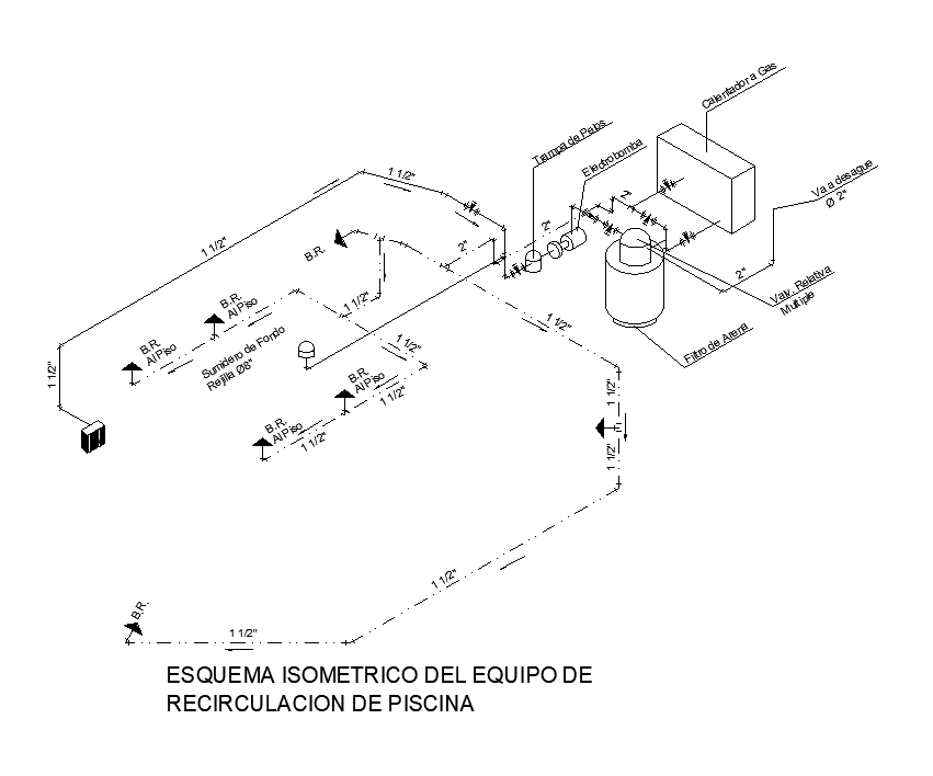 Isometric diagram of the swimming pool recirculation equipment is given in this Autocad drawing model. Download now.