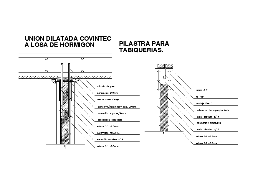 Covintec expanded joint to concrete Slab is given in this Autocad drawing model. Pillar for board details are given. Refined plaster, ?10mm perforation, fourth rod, expansion, exp polystyrene 20mm, expanded polystyrene, stucco 3: 1 c2.5cms, and other details are given. For more details download the Autocad file. Thank you for downloading the Autocad file and other CAD program files from our website.