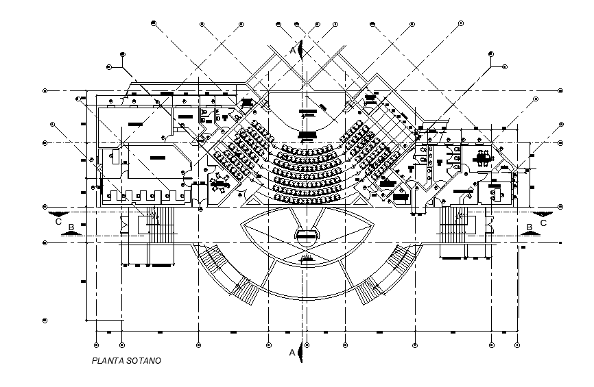 Basement floor plan of the auditorium is given in this Autocad drawing file. Download the 2D Autocad file.