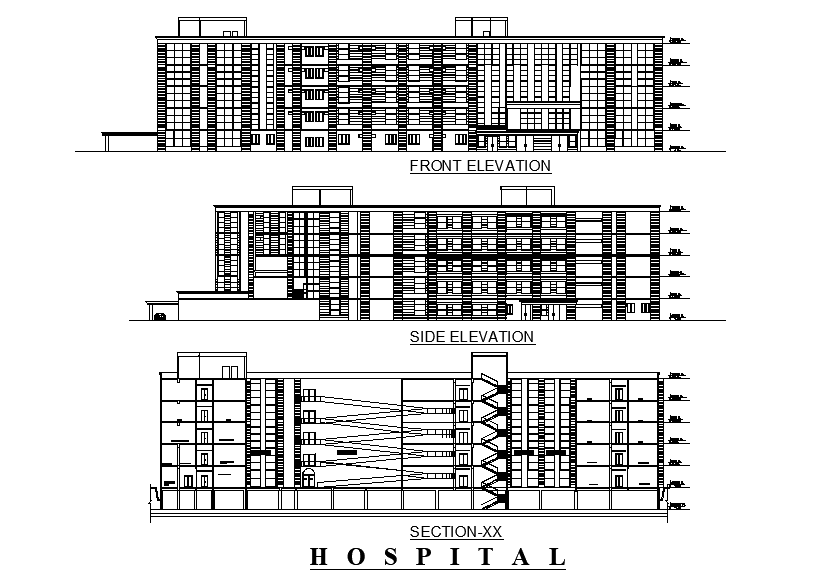 Section & elevation of 92x89m hospital building is given in this Autocad drawing model. Download now.
