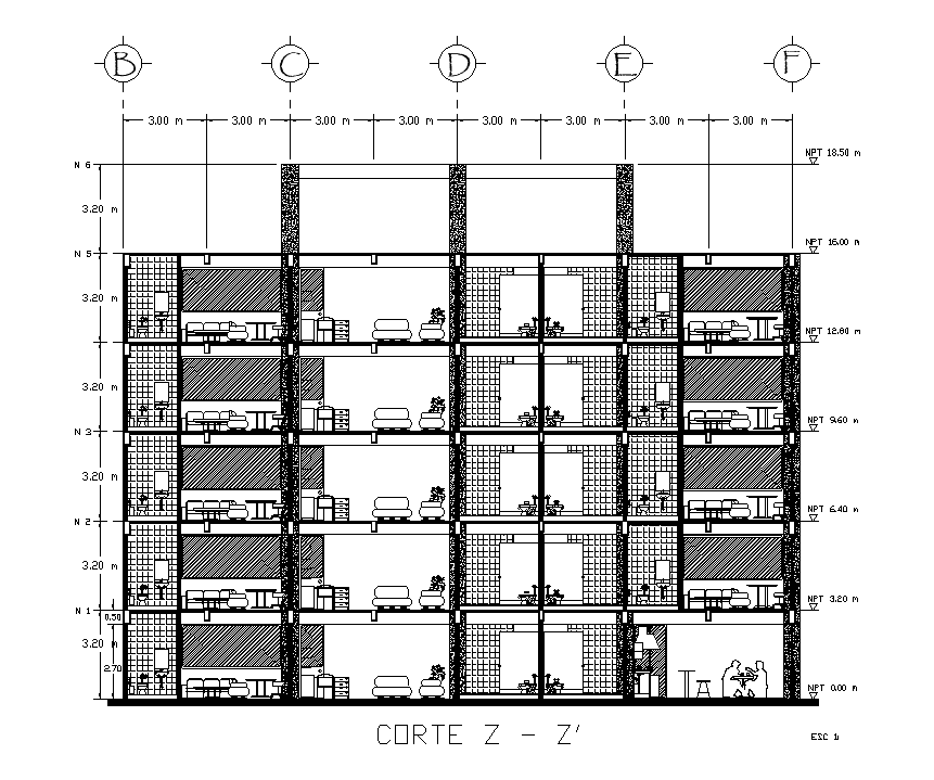 Left side section view of 15x24m office building is given in this Autocad drawing file. Download now.
