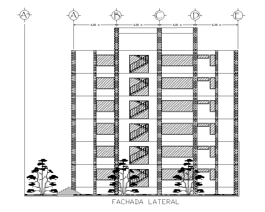 Left side elevation of 15x24m office building is given in this Autocad drawing file. Download now.