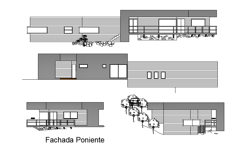 Single story house building elevation has given in this Autocad drawing file. Four side elevations are given. Trees are provided at the left side of the building. For more details download the Autocad file. Thank you for downloading the Autocad file and other CAD program files from our website.