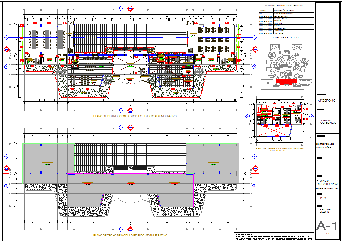 Administrative building architecture plans.Include sections, floor plan, elevations and detail of constructions.
