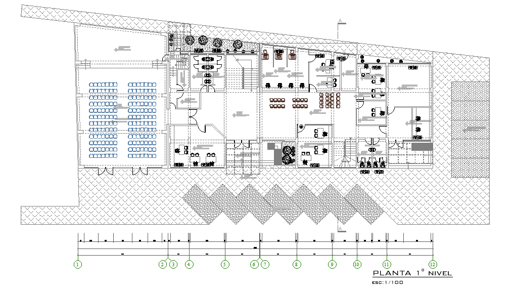 Commercial office building ground floor plan drawing define in this file. Download 2d autocad drawing file.