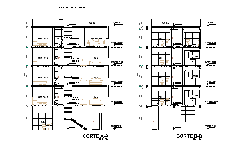 A section view of 7x10m house building is given in this Autocad drawing file. This is G+4 house building. In this plan two houses are available. These houses are consists of living area, kitchen, dining area, master bedroom, guest room, common toilet and other details are mentioned. For more details download the Autocad drawing file. Thank you for downloading the Autocad drawing file and other CAD program files from our website.