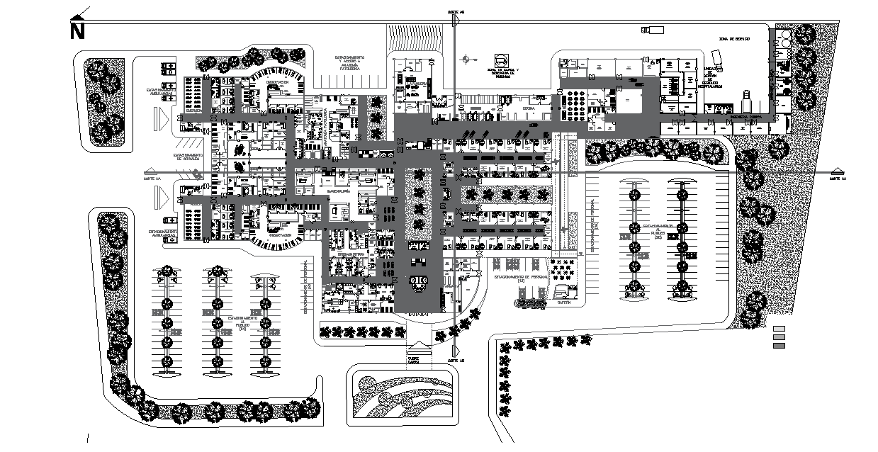 291x144m hospital plan has been given in this Autocad drawing file. Download now.