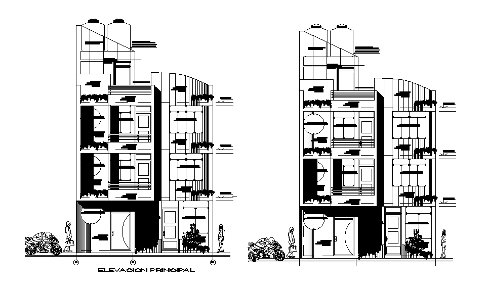 An elevation view of 8x25m hotel building is given in this Autocad drawing file. Download now.