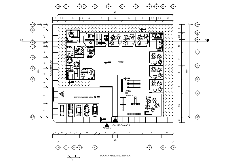 42x33m admin office plan is given in this Autocad drawing file. Download now.