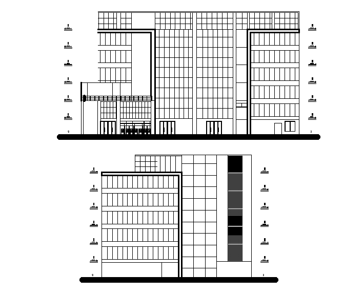 An elevation view of 64x43m finance office plan is given in this Autocad drawing file. Download now.