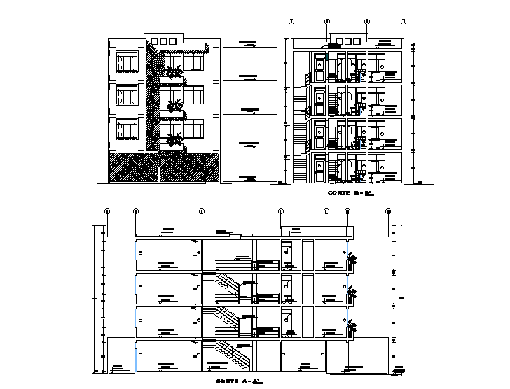 An elevation and section view of 10x25m house plan is given in this Autocad drawing file. This is G+3 apartment building. In each floor two houses are available. These houses are consists of the living area, kitchen, dining area, common toilet, study room, master bedroom with attached toilet, kid’s room with attached toilet and other details are available. For more details download the Autocad drawing file. Thank you for downloading the Autocad files and other CAD program files from our website.