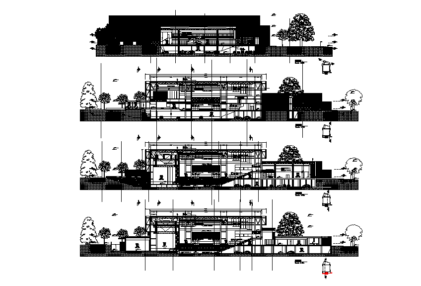 Four side section view of the office building is given in this Autocad drawing file. Download now.