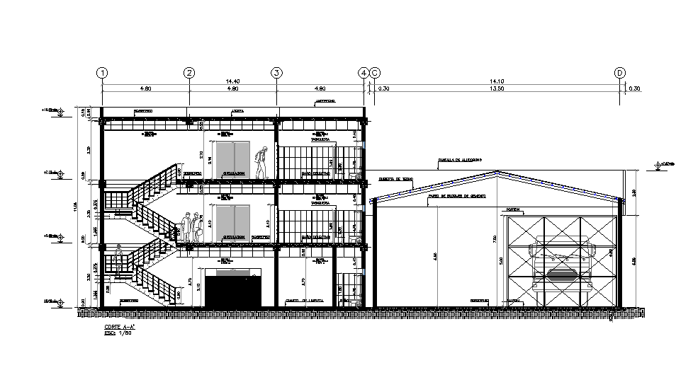 11m height of the office building corte view is given in this Autocad drawing file. Download now.