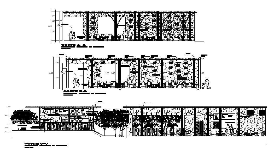 Restaurant section detail AutoCAD drawing defined in this file. which consist of the stone texture detail wall, furniture layout, main hall, services, and utilities detail with furniture detail and entrance door, window marking, and glass curtain wall design. Download the AutoCAD file now. Thanks for downloading the file and another CAD program from the cadbull.com website.