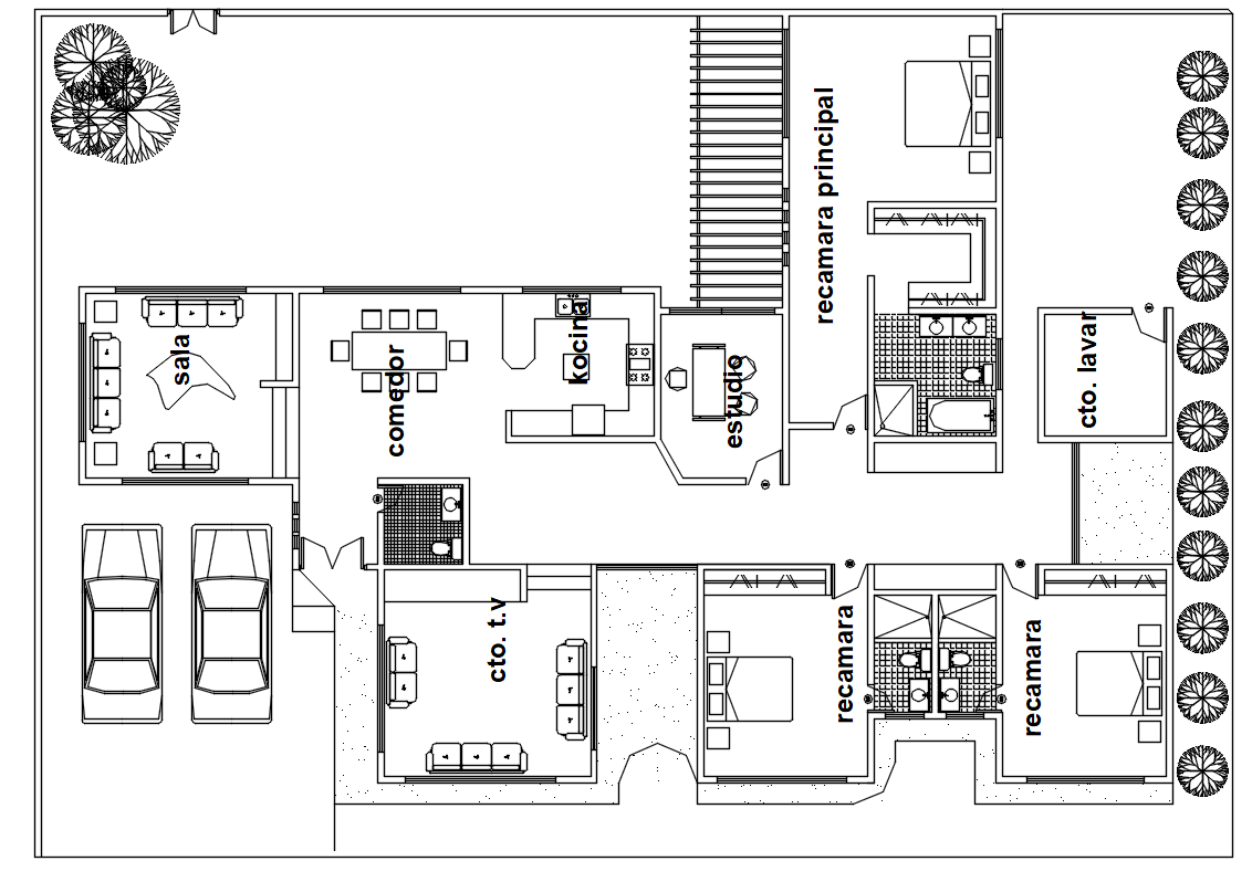 The residence architecture house plan with space planning furniture layout CAD drawing which includes 3 master bedrooms with an attached toilet, study room, kitchen, drawing room, living lounge, and 2 car parking area detail. Thank you for downloading the Autocad drawing file and other CAD program files from our website.