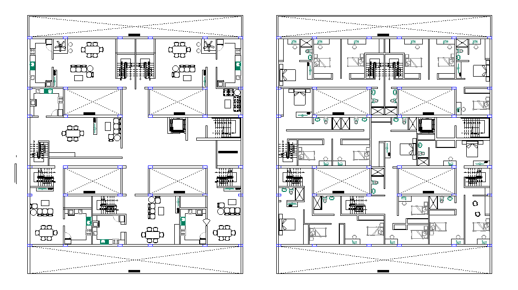 The residence architecture apartment building ground floor and first-floor plan with furniture layout AutoCAD drawing that shows 3 BHK and 4 BHK plan. the additional drawing detail such as column layout plan. Thank you for downloading the Autocad drawing file and other CAD program files from our website.