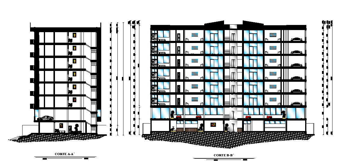 Section view of 39x17m twin house plan is given in this Autocad drawing file. This is G+7 apartment building. In this plan master bedroom with attached toilet & dressing room, guest room, common toilet, family hall, kid’s room with attached toilet, kitchen, and other details are available. For more details download the Autocad file. Thank you for downloading the Autocad file and other CAD program files from our website.