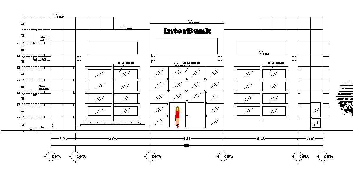 Bank front elevation detail drawing is given in this AutoCAD file. Download 2d autocad drawing file.