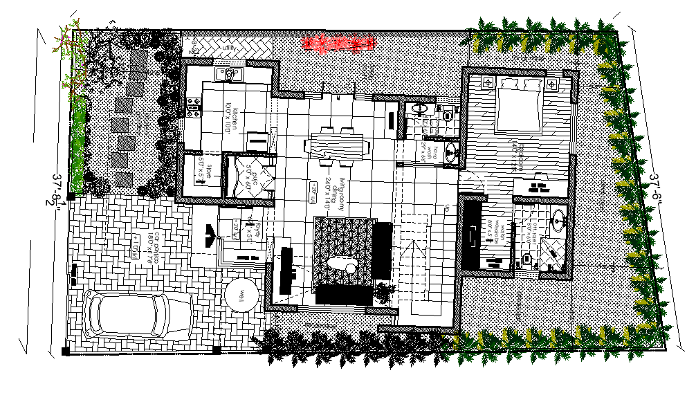 Bungalow floor plan detail presented in this Autocad drawing file. In this file, the plan, and section of car parking, garden, kitchen, dining room, living room, bedroom, and common toilets are mentioned. Thank you for downloading the 2D AutoCAD DWG drawing file and other CAD program files from our website. Download this 2d AutoCAD drawing file.