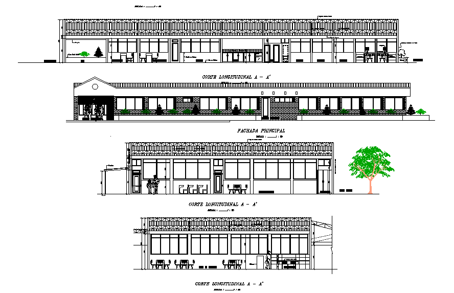 An elevation and section view of 33x8m hostel building is given in this Autocad drawing file. Download now.