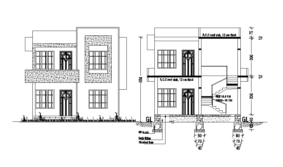 A section view of 18x8m house building is given in this Autocad drawing file. This is G +1 house building. Kitchen, dining area, living hall, lounge, guest room with attached toilet, open terrace kitchen, maid room with attached toilet, store room, lobby, master bedroom with attached toilet and many details are given in this drawing model. For more details download the Autocad drawing file. Thank you for downloading the Autocad files and other CAD program files from our website.