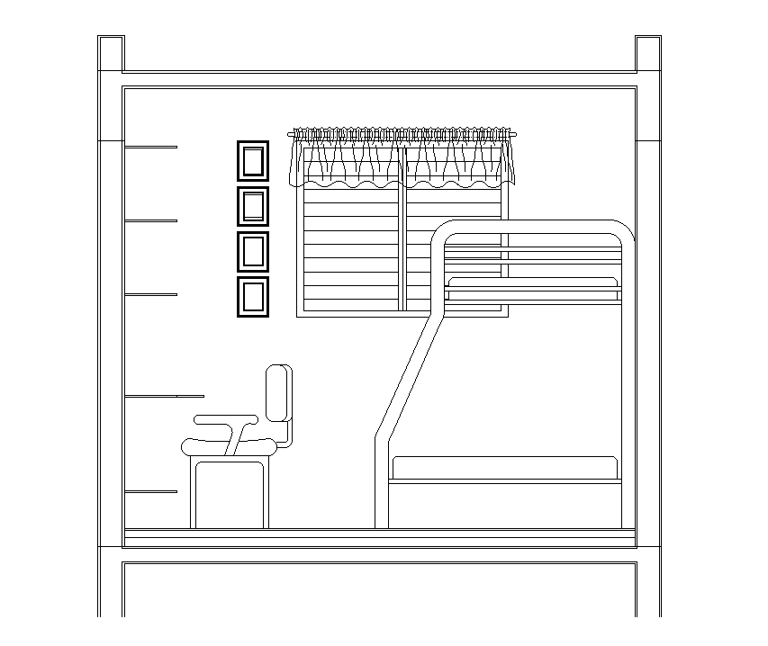 A section view of the bedroom is given in this Autocad drawing file. Total height of the bedroom is 98”. In this showcase details are given. Like chair and table, system place and other details are available. For more details download the Autocad file. Thank you for downloading the Autocad file and other CAD program files from our website.