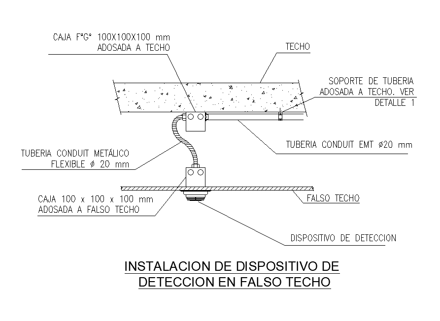 Installation of detection device in false ceiling is given in this Autocad drawing file. This is electrical drawing. Flexible metallic conduit pipe ? 20 mm, box 100 x 100 x 100 mm adjusted to false ceiling, emt conduit pipe ?20 mm, false ceiling, and other details are given. For more details download the Autocad file. Thank you for downloading the Autocad file and other CAD program files from our website.